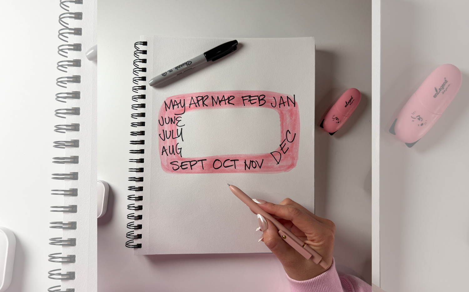 This is exactly how I see mine! Shading and all! I think of it like a clock starting with December as 12 and then going to January clockwise. I also visualize my weeks like that too and monday is always on the inside of the circle. So if it’s March Monday will be on the left and if it’s September Monday will be on the right.